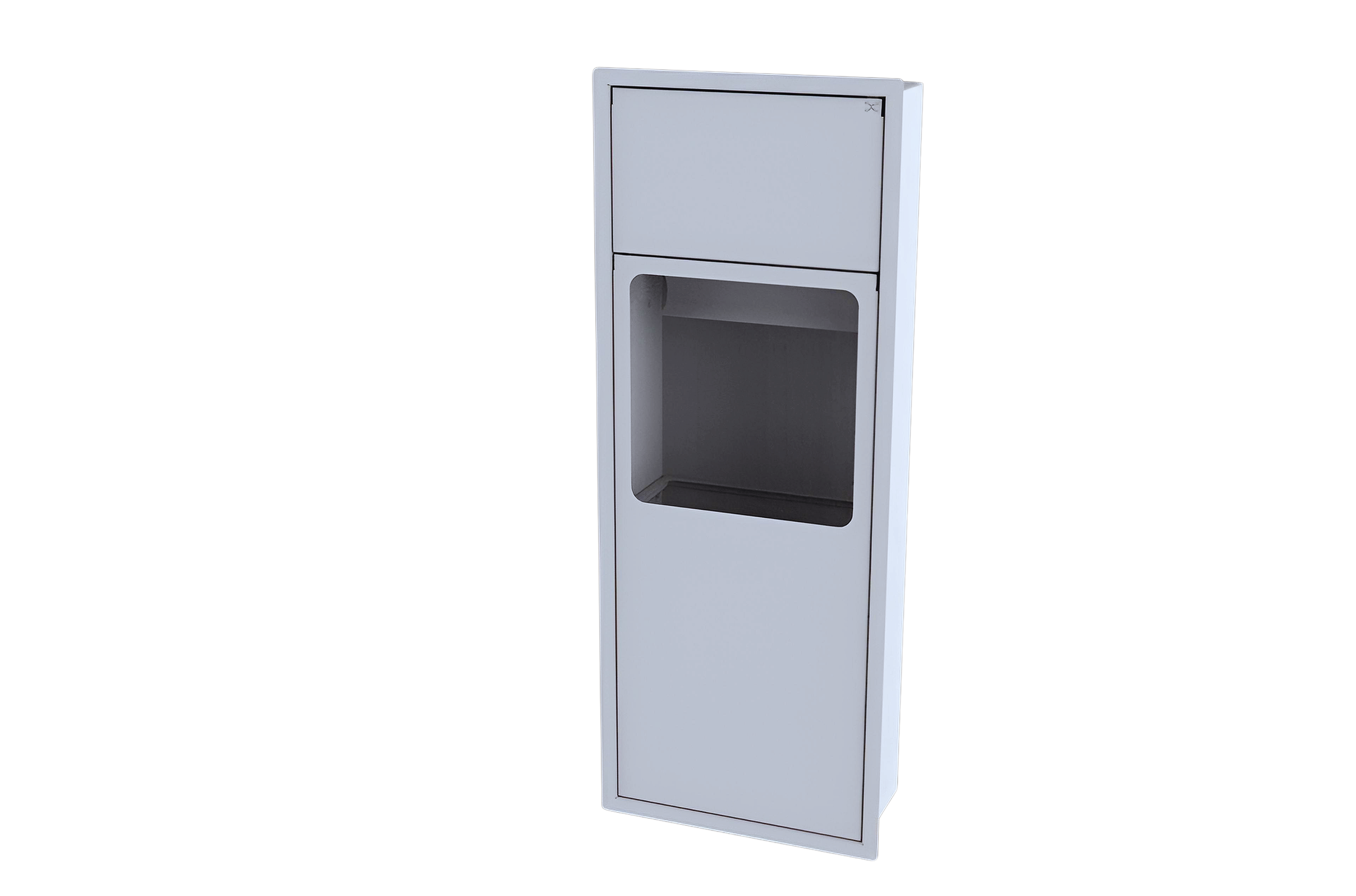 Com design retangular moderno, este modelo garante um visual sofisticado e discreto quando embutido na parede. A tampa com sistema click (fecho pulsador) permite abertura higiênica sem contato direto com o lixo, mantendo o ambiente sempre limpo e organizado.