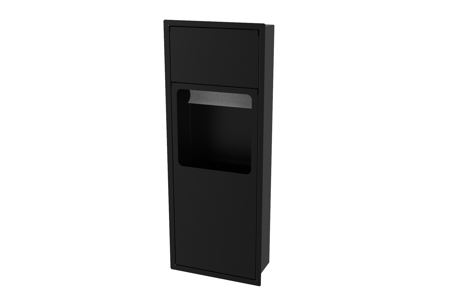 Com design retangular moderno, este modelo garante um visual sofisticado e discreto quando embutido na parede. A tampa com sistema click (fecho pulsador) permite abertura higiênica sem contato direto com o lixo, mantendo o ambiente sempre limpo e organizado.